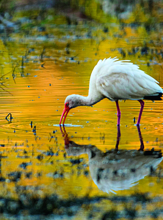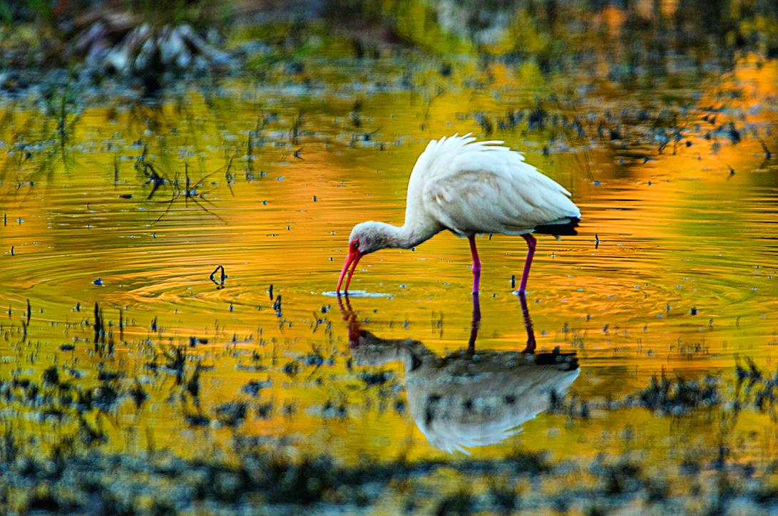 The eel invasion affects white ibises, which feed on crayfish.