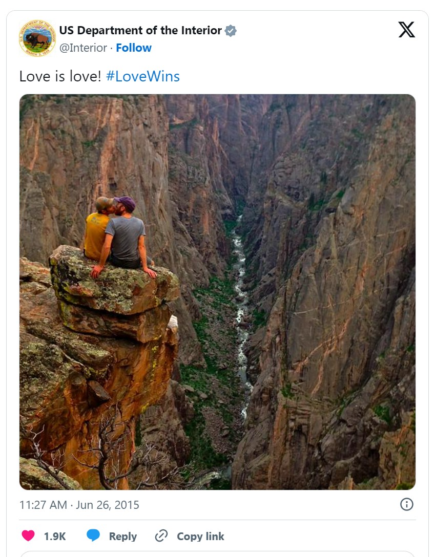 Despite setbacks during the Trump administration, the National Park Service has made strides toward inclusivity in recent years, including President Obama’s designation of Stonewall as a national monument in 2016. On the day the Supreme Court declared same-sex marriage legal throughout the United States, the Department of the Interior celebrated by sharing a photo of my colleague Alex Johnson kissing his husband in Black Canyon of the Gunnison National Park.