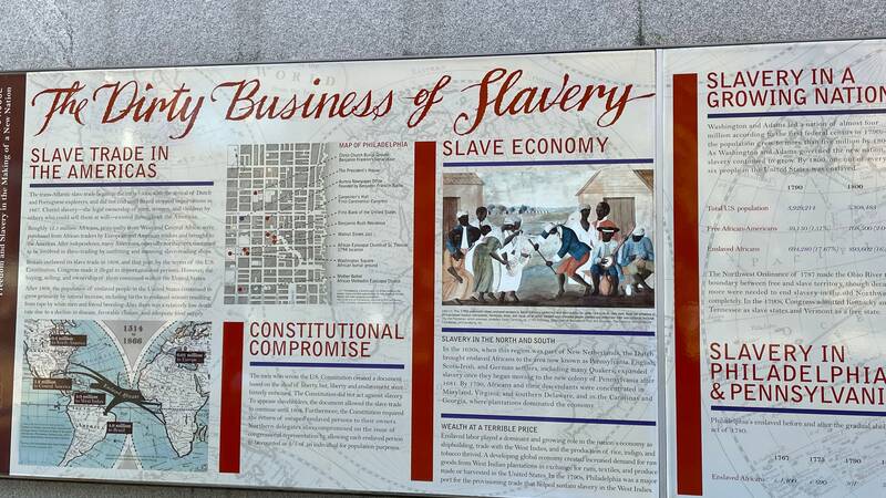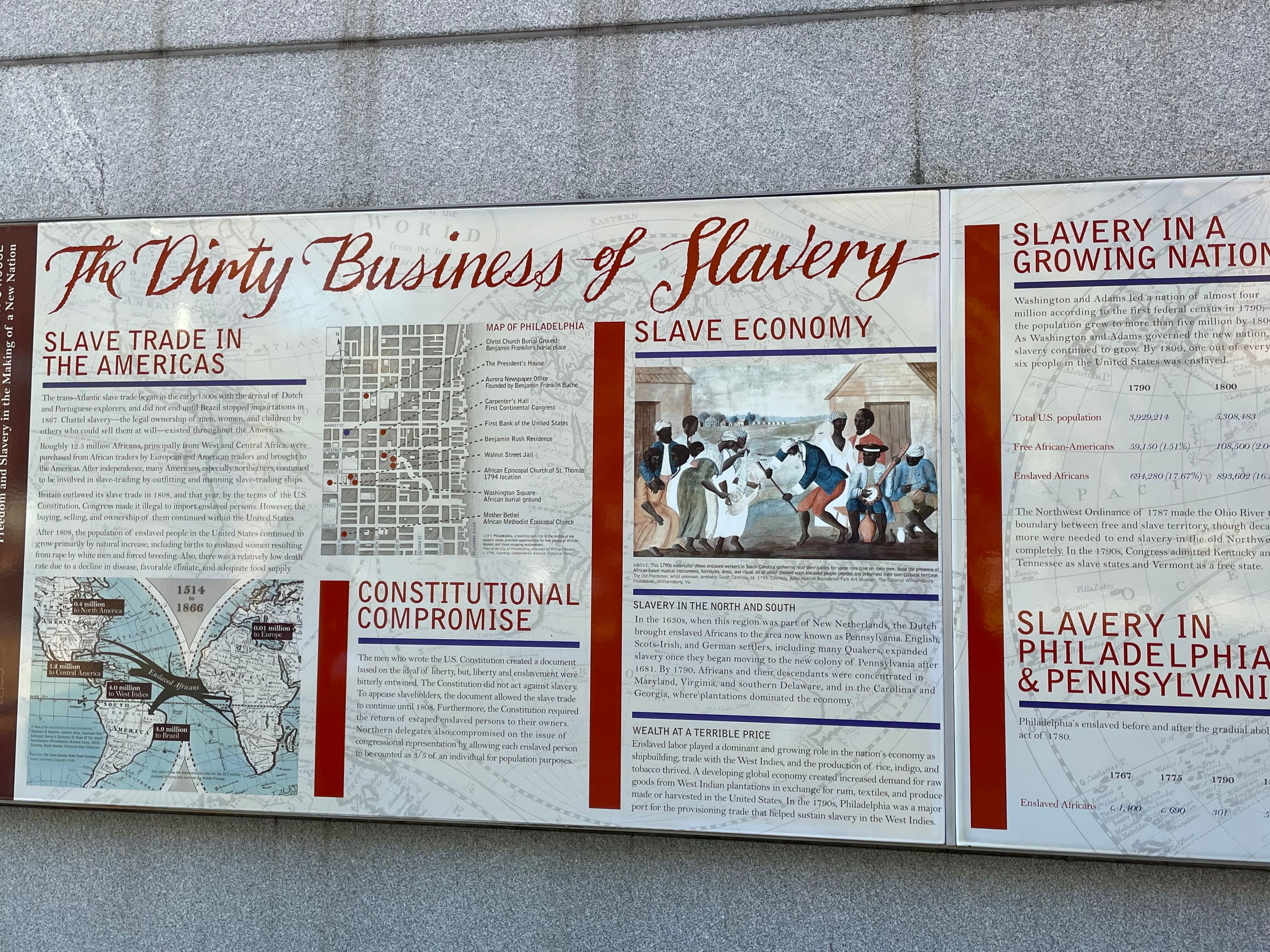 In January 2026, the Philadelphia Inquirer published video footage showing National Park Service staff using crowbars to remove this sign from the President’s House Exhibit at Independence National Historical Park.